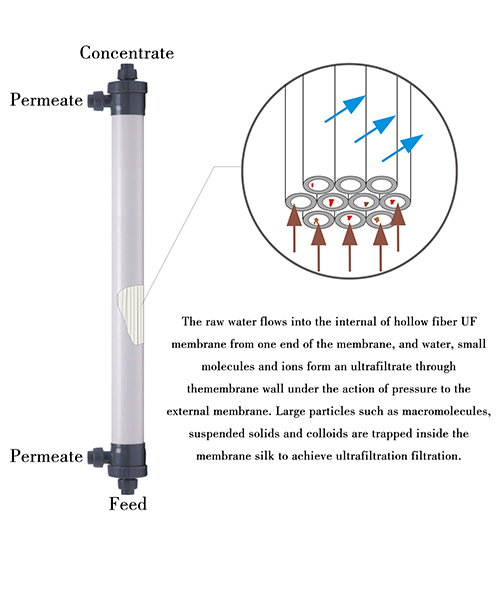 ● Когда мембранный модуль UF работает, загрязняющие вещества задерживаются на внутренней поверхности мембранного шелка, что устраняет проблему мертвого угла и облегчает стирку