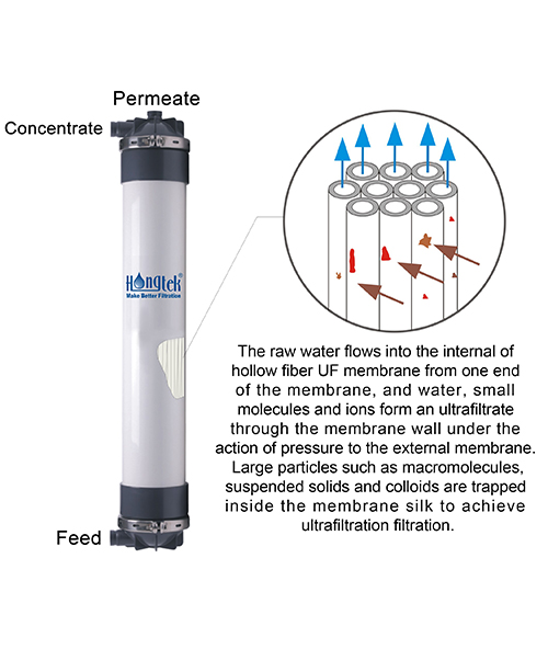 Ультрафильтрационный мембранный модуль из полого волокна PVDF серии Hongtek UFM225 изготовлен из мембраны из полого волокна PVDF толщиной 0,1 микрона и может эффективно удалять вредные вещества, такие как бактерии, осадок, ржавчина, коллоиды и тяжелые металлы из воды. Ультрафильтрационная мембрана PVDF изготовлена из гидрофильного модифицированного материала PVDF, обеспечивающего высокую производительность по воде, сильную защиту от загрязнения, хорошую химическую стойкость, ее нелегко блокировать и длительный срок службы. Ультрафильтрационные модули из полого волокна PVDF широко используются в нефтехимии, производстве продуктов питания и напитков, медицине и фармацевтике, повторном использовании очищенной воды, очистке сточных вод и других отраслях промышленности.